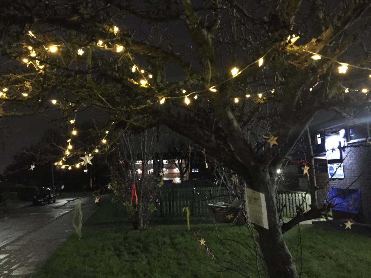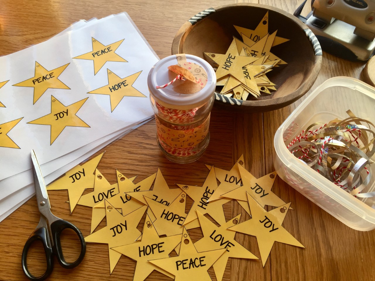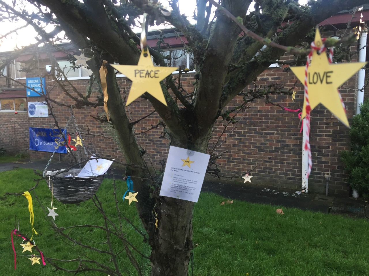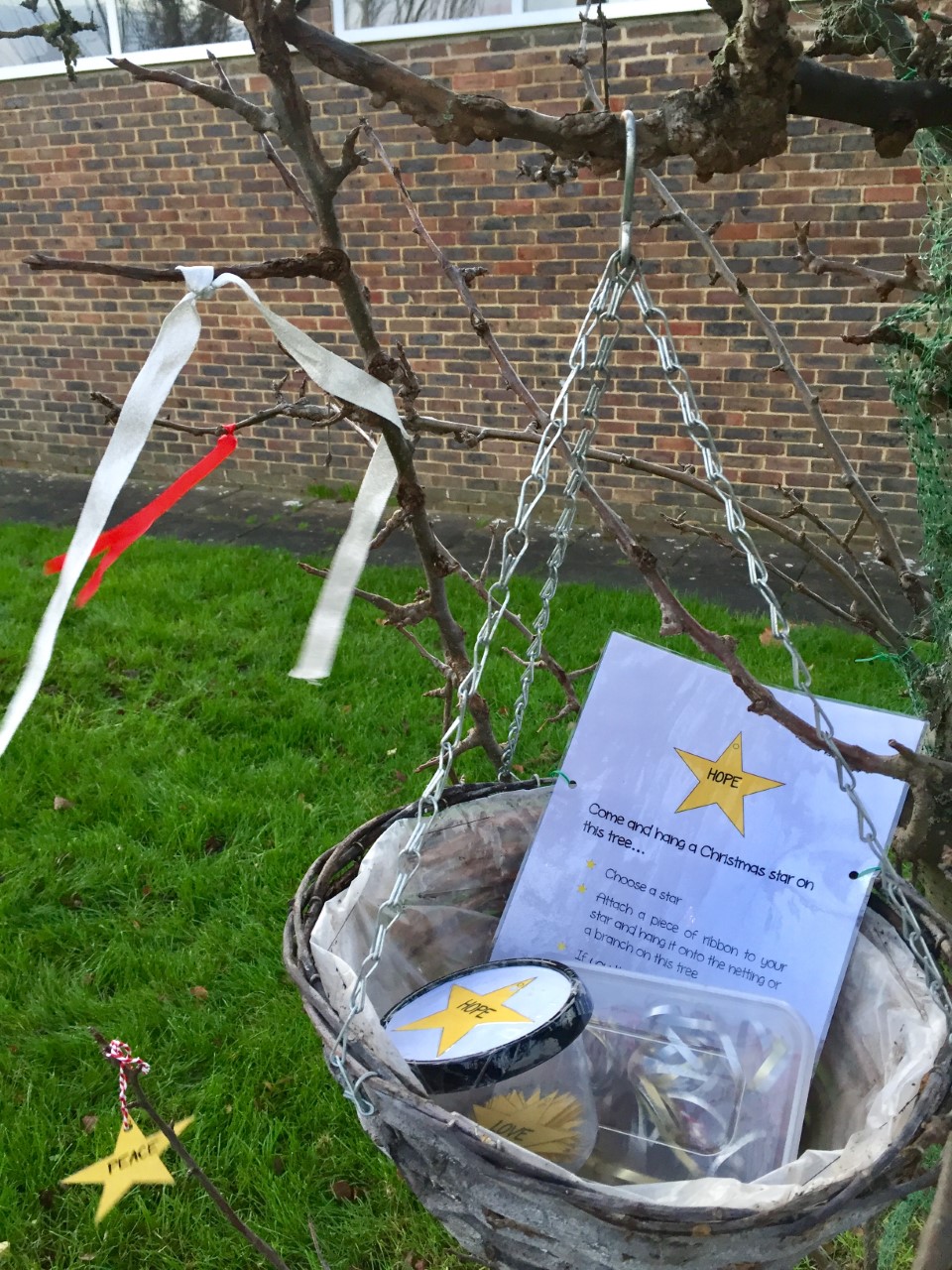 It is great that St Richard’s, the church to which our flat is attached, is keen to reach the local community too. When thinking about what we could do in the lead-up to Christmas that might engage the community, the vicar had an idea which I then developed and organised. The idea was to invite passers-by to hang a ‘Star of Hope’ (or peace, love, joy) on a tree outside the church, and take one away with them. The instructions invite people to say a simple prayer for hope, peace, love or joy for themselves or someone else. I enjoyed laminating, cutting and preparing this activity, and am really encouraged that the tree now has several stars on it!